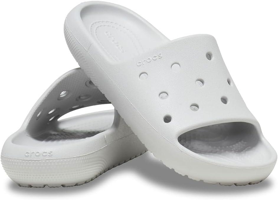 Comfortable and easy to clean, the Crocs Kids Classic Slide V2 is incredibly lightweight. It features an open round toe shape, thermoplastic EVA upper with holes with breathability, and an easy slip-on style. The crocs are crafted with thermoplastic